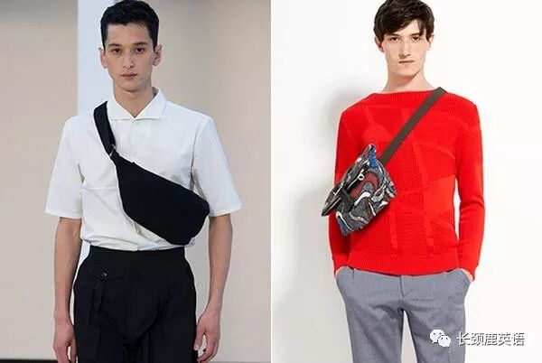 还有一种男士用的随身小包叫fanny pack,二十年前中国流行过,就是做生意的小老板儿们人人都穿在皮带上的那种腰包。现在不流行腰包了,但fanny pack这种类型的包还有,只不过年轻人喜欢斜背在胸前了。